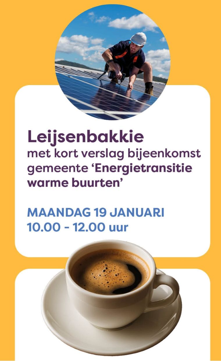 Bij het eerste Leijsenbakkie van 2026 krijgt de stuurgroep van de buurtgroep het woord: Maurits Prins zal ons bij praten over de bijeenkomst van de Warme Buurten over de Eenrgietransitie in die buurten waarvan wij er één zijn. En we worden vast ook bijgepraat over hoe het er voor staat met onze buurtgroep.